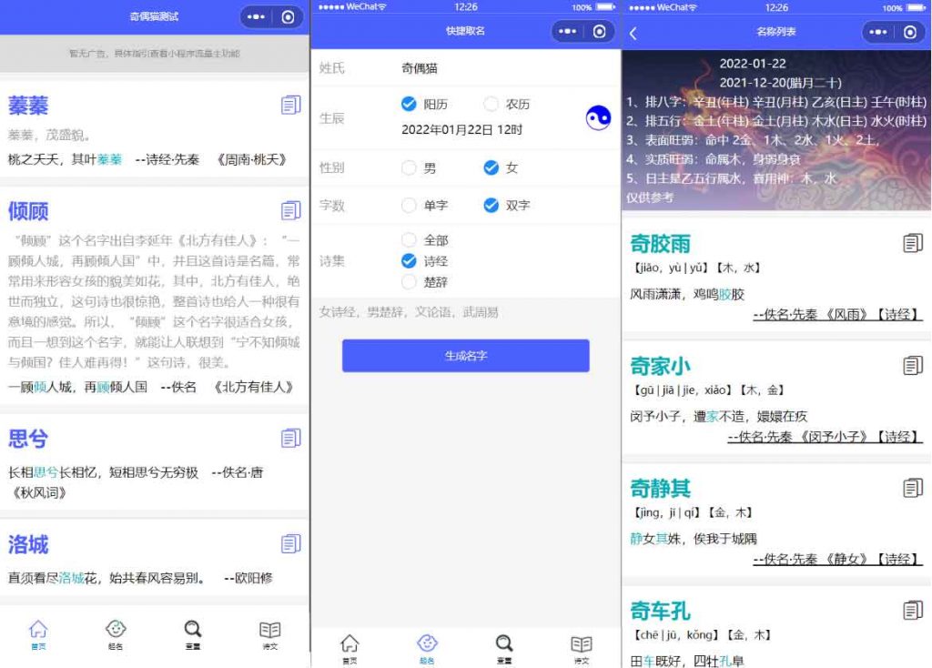 小程序源码由多个功能组合而成,具体如下 名字来源查询 取名工具(支持多种选择取名) 查询重复名(输入名字查询有多少人和你吃饭) 诗文(里面就是一些古诗啥的展示) 另外也给加了一些流量主进去!